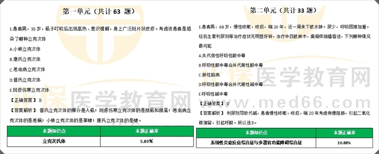 2021年医师资格考试《错题集》总结整理了执业四个单元,助理两个单元的错题,错题下方用表格贴心标注了该题目的正确率、正确答案和解析,以及覆盖的易错考点,考生可根据错题率参考复习相应易错考点。
