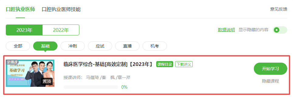 2023年医师备考全面开启!2023年口腔执业医师基础学习新课开通!目前由秦枫老师授课的《临床医学综合》科目课程已更新完毕!已购课同学可以直接进入我的网校我的家-我的课程-临床医学综合科目进行学习!2023年口腔执业医师《临床医学综合》考试大纲/教材具体内容下方查看。未购课学员点击此处进入选择课程>>,具体看课位置如下: