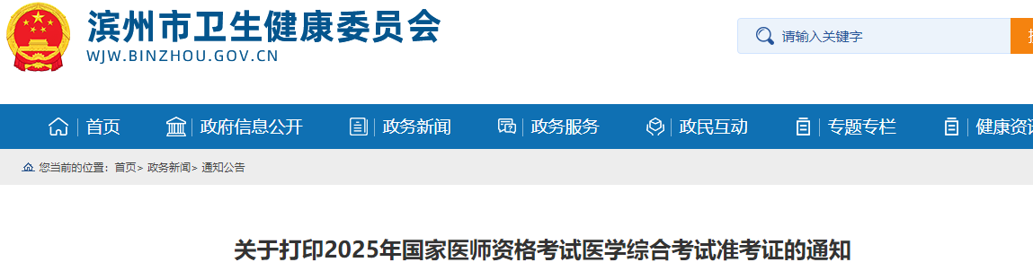 山东滨州2025年医师资格综合笔试准考证8月15日起可打印!请相关考生及时查看,做好应试准备!
