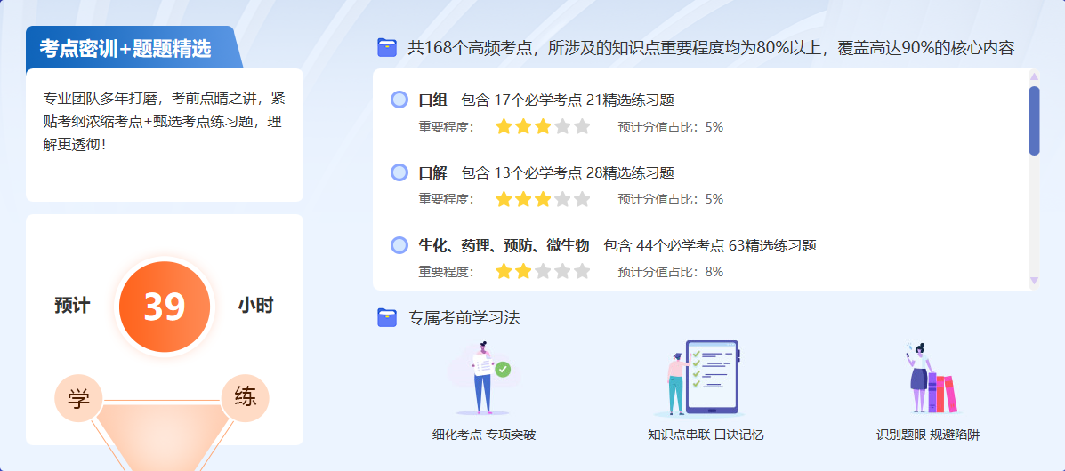 阶段一:刷题密训班:考点密训+题题精选1、围绕考纲老师甄选高频考点2、模块式刷题讲练熟悉解题思路3、以题带点。以点带面,考点巩固,学练结合4、化繁为简,节省备考时间专业团队多年打磨,考前点睛之讲,紧贴考纲浓缩考点+甄选考点练习题,理解更透彻!阶段二:实战模考:高仿真模拟实战预测1、3套模考测试老师带刷其中1套2、课堂实时互动,不留疑惑3、老师亲自选题,科学组卷贴近考情4、实战模拟了解试题方向临考实战,覆盖考试出题点,抓住做题规律,举一反三,真正做会、做懂、做透。课程安排以方案页为准。详情查看>>