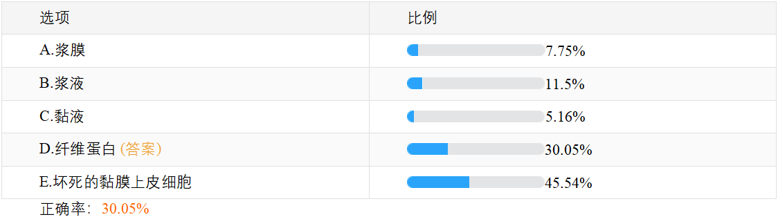 关于“【正确率30.05%】假膜性炎渗出物中的特征成分是?”,相信很多正在备战2023年临床执业医师考试的考生十分关注,此题在摸底测试50题(点击参加测试>>)中正确率仅为30.05%,建议大家及时复习,牢固掌握相关知识点!