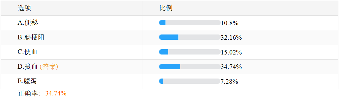 关于“【正确率34.74%】升结肠癌的主要表现是?”,相信很多正在备战2023年临床执业医师考试的考生十分关注,此题在摸底测试50题(点击参加测试>>)中正确率仅为34.74%,建议大家及时复习,牢固掌握相关知识点!