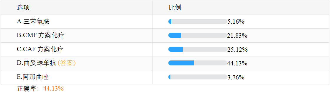 关于“术后病理免疫组化结果显示HER2强阳性,其后续治疗首选?”,相信很多正在备战2023年临床执业医师考试的考生十分关注,此题在摸底测试50题(点击参加测试>>)中正确率仅为44.13%,建议大家及时复习,牢固掌握相关知识点!