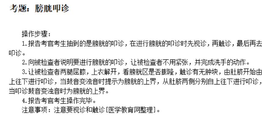 以上关于“膀胱叩诊操作步骤及注意事项——临床执业医师体格检查历年考点”的文章由医学教育网编辑整理搜集,更多的文章随时关注医学教育网临床执业医师实践技能辅导精华栏目,医学教育网也为广大考生提供视频讲解,可以点击这里了解班次>>