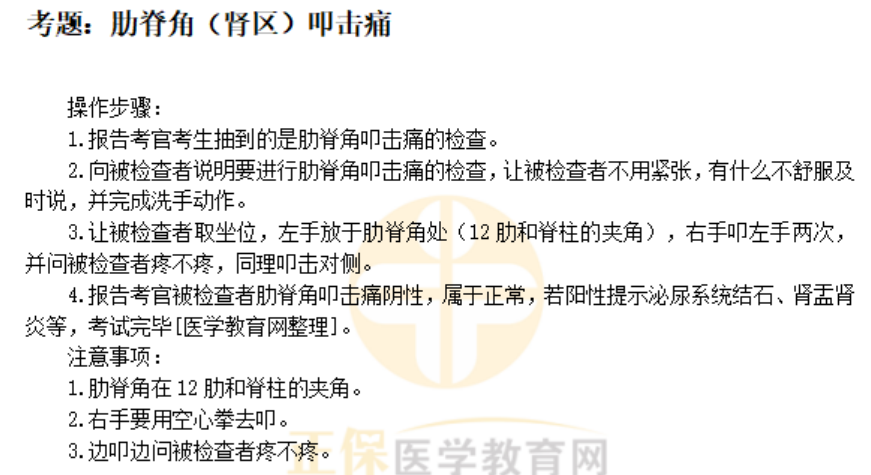 以上关于“肋脊角(肾区)叩击痛的检查——临床医师体格检查历年考点”的文章由医学教育网编辑整理搜集,更多的文章随时关注医学教育网临床执业医师实践技能辅导精华栏目,医学教育网也为广大考生提供视频讲解,可以点击这里了解班次>>