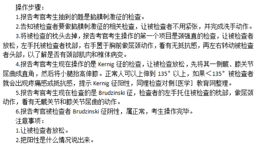 脑膜刺激征检查步骤及注意事项——临床医师体格检查历年考点如下,实践技能第二站体格检查是考试难点之一,为了帮助广大医考生学习,医学教育网老师专门总结了“体格检查”历年考点,预祝大家都能取得优异成绩: