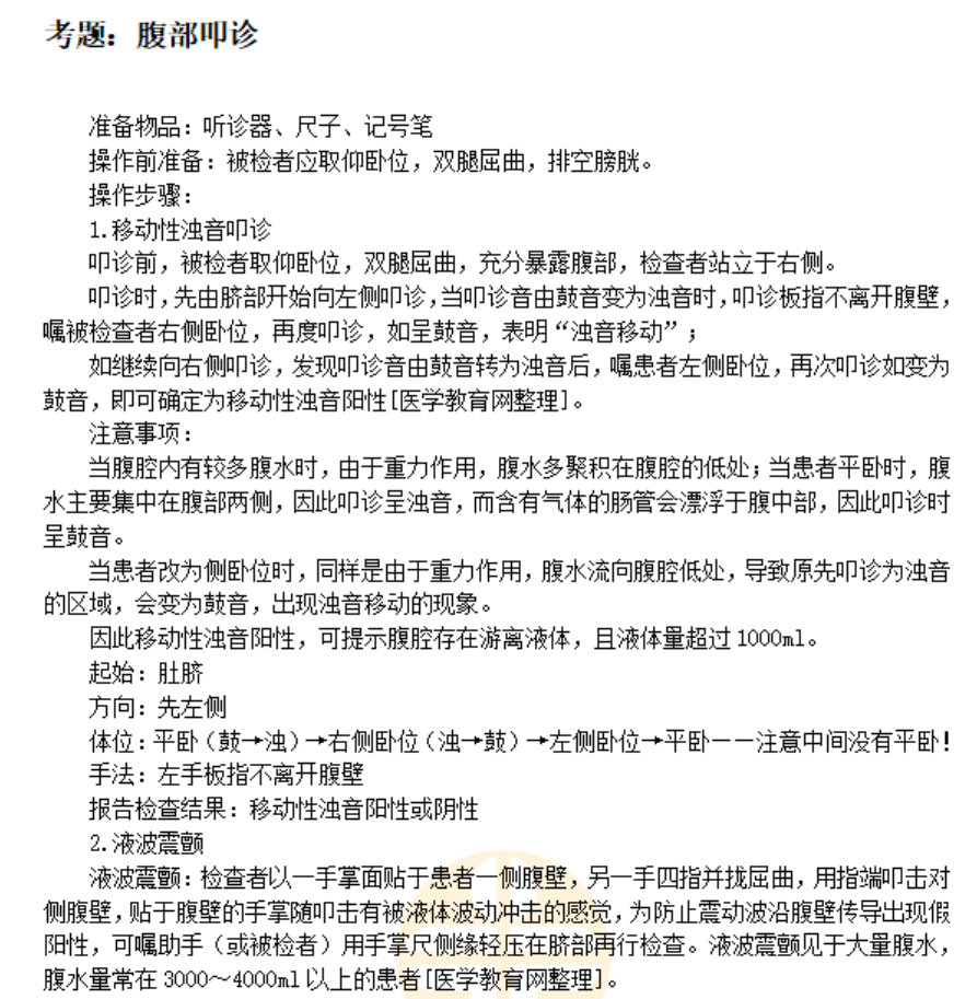腹部叩诊操作步骤及注意事项——临床医师体格检查历年考点如下,实践技能第二站体格检查是考试难点之一,为了帮助广大医考生学习,医学教育网老师专门总结了“体格检查”历年考点,预祝大家都能取得优异成绩: