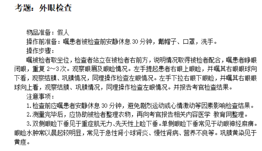 以上关于“外眼检查的步骤及注意事项——临床医师体格检查历年考点”的文章由医学教育网编辑整理搜集,更多的文章随时关注医学教育网临床执业医师实践技能辅导精华栏目,医学教育网也为广大考生提供视频讲解,可以点击这里了解班次>>