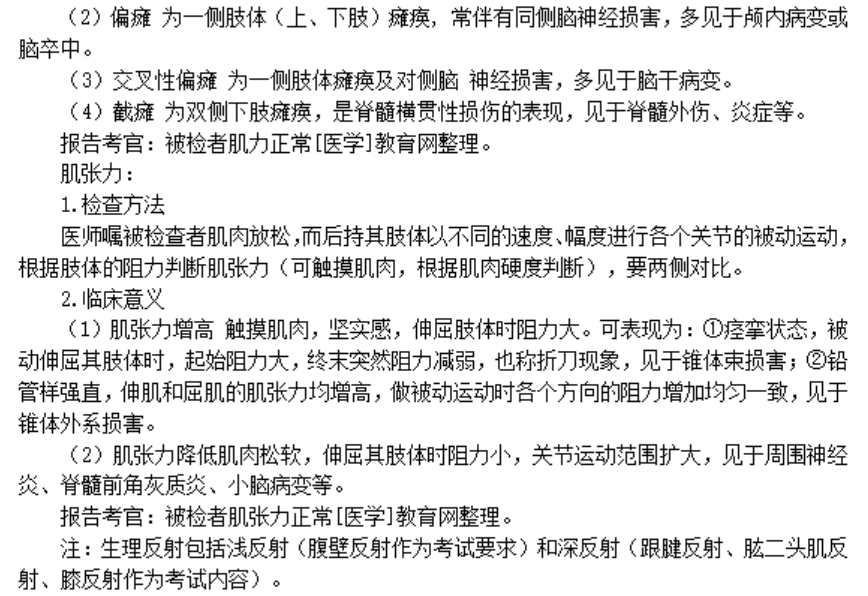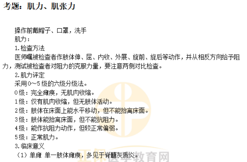 以上关于“肌力、肌张力操作步骤及注意事项——临床医师体格检查历年考点”的文章由医学教育网编辑整理搜集,更多的文章随时关注医学教育网临床执业医师实践技能辅导精华栏目,医学教育网也为广大考生提供视频讲解,可以点击这里了解班次>>