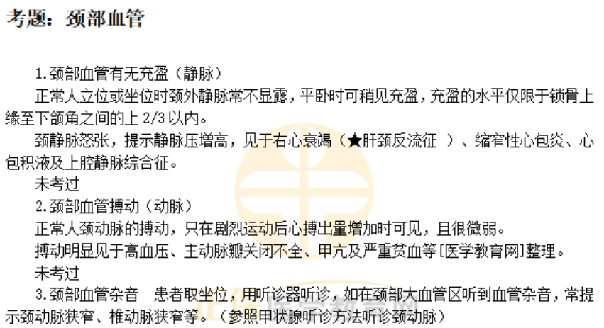 颈部血管的检查操作步骤及注意事项——临床医师体格检查历年考点如下,实践技能第二站体格检查是考试难点之一,为了帮助广大医考生学习,医学教育网老师专门总结了“体格检查”历年考点,预祝大家都能取得优异成绩: