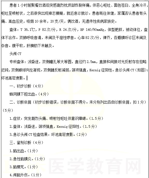 蛛网膜下腔出血考点例题:男性,40岁。突发头痛、呕吐伴神志模糊1小时。2022年临床医师实践技能考试正在进行中,医学教育网编辑预祝各位考生顺利参考,取得好成绩!
