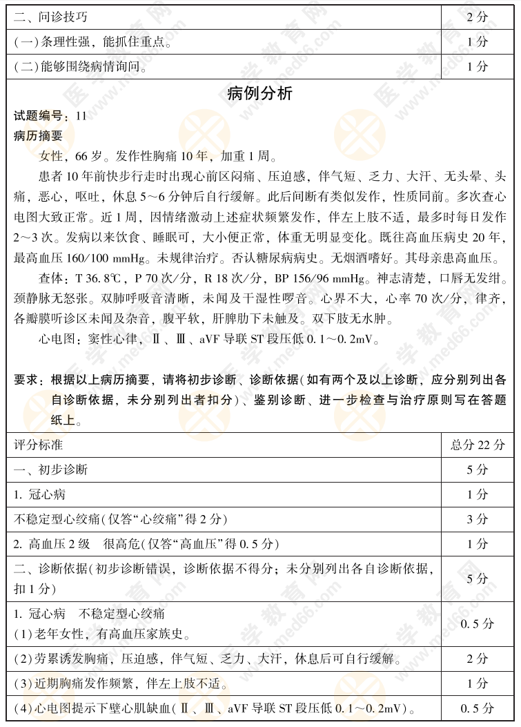 2022年临床医师病史采集+病例分析考前模拟卷第11套(含评分标准)如下,2022年临床执业医师实践技能考试在即,医学教育网整理了实践技能考前指导手册(查看活动详情>>),包含技能各站精选模拟试题,查看2022年临床执业医师技能集训营,畅享考前直播课>>