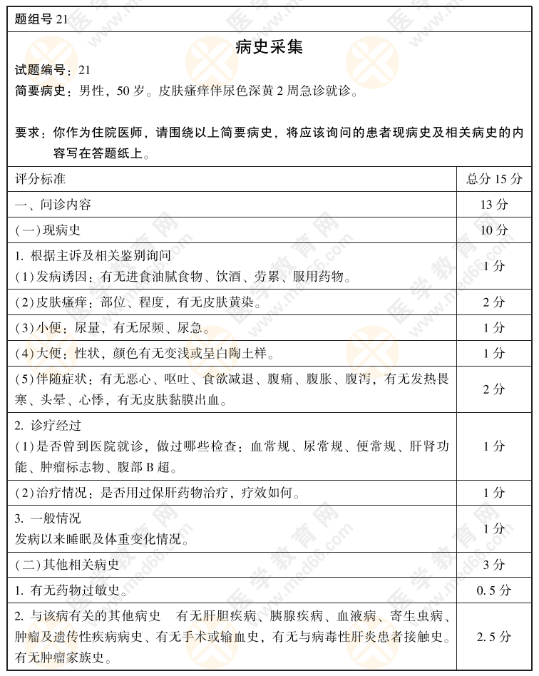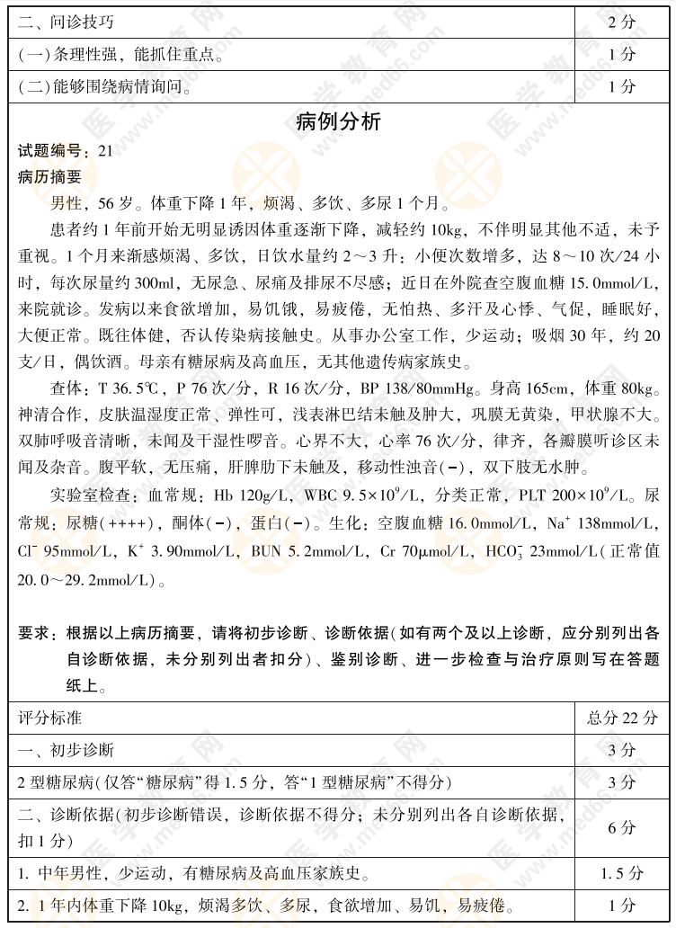 2022年临床医师病史采集+病例分析考前模拟卷第21套(含评分标准)如下,2022年临床执业医师实践技能考试在即,医学教育网整理了实践技能考前指导手册(查看活动详情>>),包含技能各站精选模拟试题,查看2022年临床执业医师技能集训营,畅享考前直播课>>