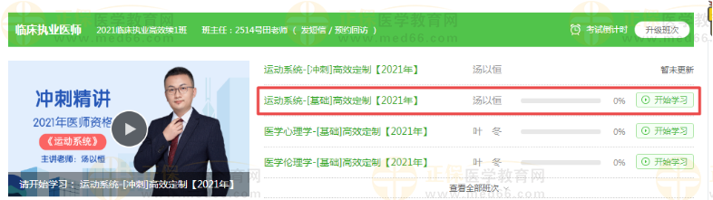 看课啦!2021年临床执业医师运动系统基础班课程已经开通啦!临床执业医师运动系统科目由网校专业师资汤以恒讲解,目前该科目基础班已经全部更新啦,已购课考生可进入我的网校我的家学习,未购课学员可以选购课程学习>>