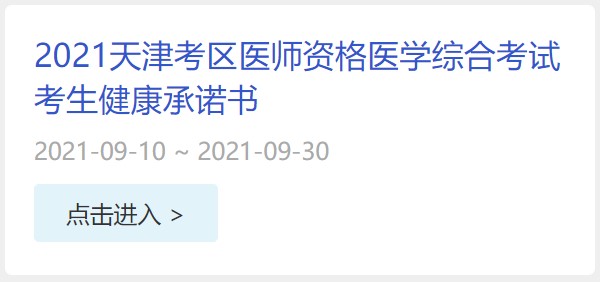 以上就是医学教育网关于“2021天津考区医师资格医学综合考试考生健康承诺书填写入口”的相关介绍,希望能够帮助到大家,更多资讯尽在医学教育网临床执业医师栏目!