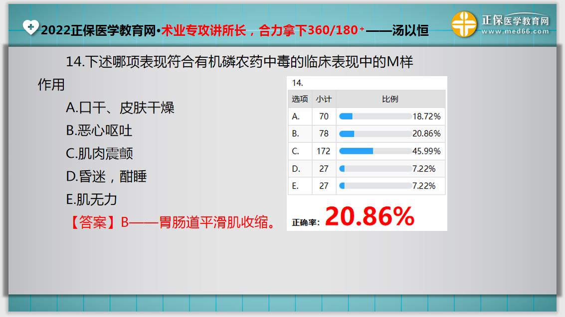 2022年临床执业医师资格考试正确率20.86%【入学测评】如下,参加2022年临床执业医师考试的同学,快来看看自己是否可以答对这道题吧!详情如下: