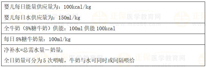 题眼:“婴儿每日能量供应量为:100kcal/kg”、“全牛奶(8%糖牛奶)供能:100ml供能100kcal”