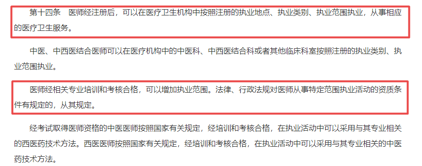 同时增加了两条新规定:一是“医师经注册后,可以在医疗卫生机构中按照注册的执业地点、执业类别、执业范围执业,从事相应的医疗卫生服务”,二是“医师经相关专业培训和考核合格,可以增加执业范围”。