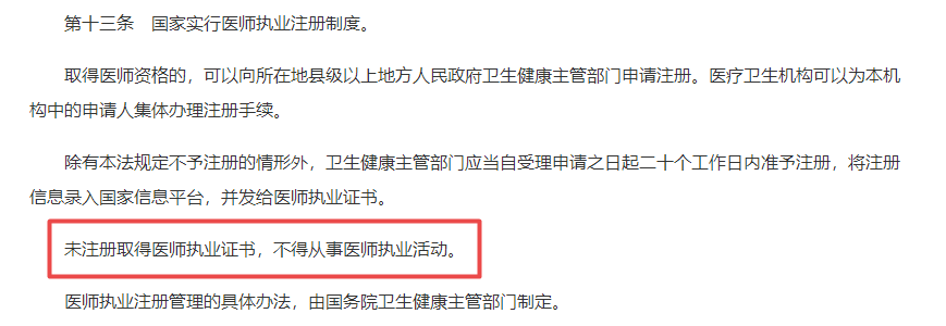 说明:由上图,与《执业医师法》对比,《医师法》沿用了“医师经注册后,可以在医疗卫生机构中按照注册的执业地点、执业类别、执业范围执业,从事相应的医疗卫生服务工作。未经医师注册取得执业证书,不得从事医师执业活动”规定。