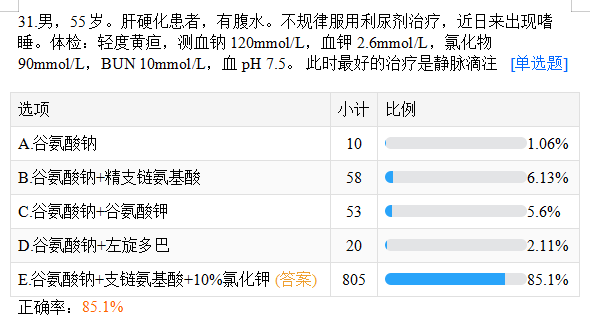 男,55岁。肝硬化患者,有腹水。不规律服用利尿剂治疗,近日来出现嗜睡。体检:轻度黄疸,测血钠120mmol/L,血钾2.6mmol/L,氯化物90mmol/L,BUN 10mmol/L,血pH 7.5。