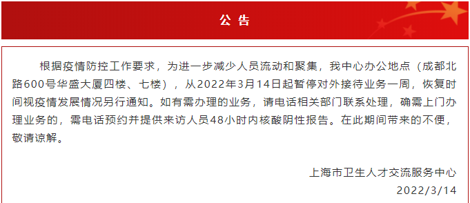 【今日起】上海市卫生人才交流服务中心暂停对外接待业务一周