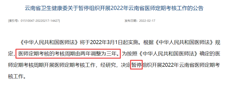 云南省重要消息!暂停2022年医师定期考核!
