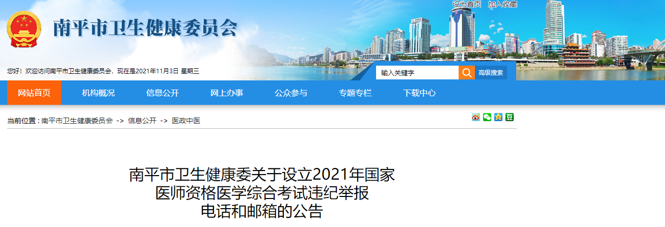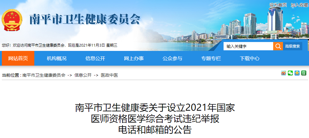 2021年国家医师资格医学综合考试(一试)将于11月13-14日举行,为了做好2021年国家医师资格考试南平考点的考务工作,严肃考试纪律,严格查处考试违规违纪行为,按照福建考区2021年医师资格医学综合考试考务工作要求,南平市设立医师资格考试违纪举报电话并予以公告。