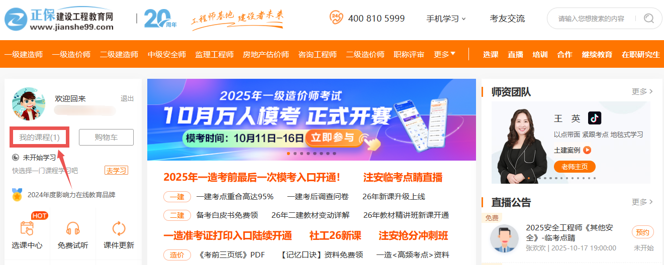 第一步:请登录正保建设工程教育网 https://www.jianshe99.com/(使用您购课的帐号密码或使用手机号验证登录)。