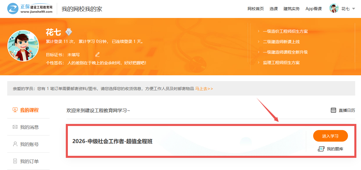 第二步:点击“我的课程”进入我的网校我的家。
