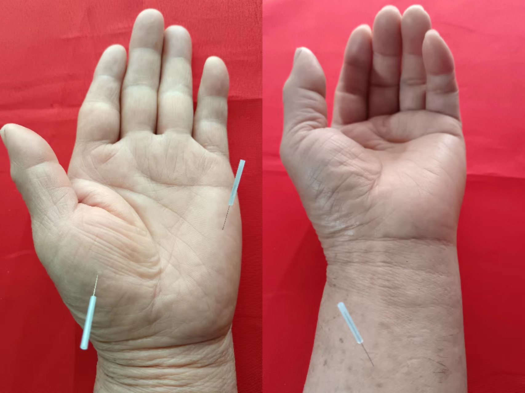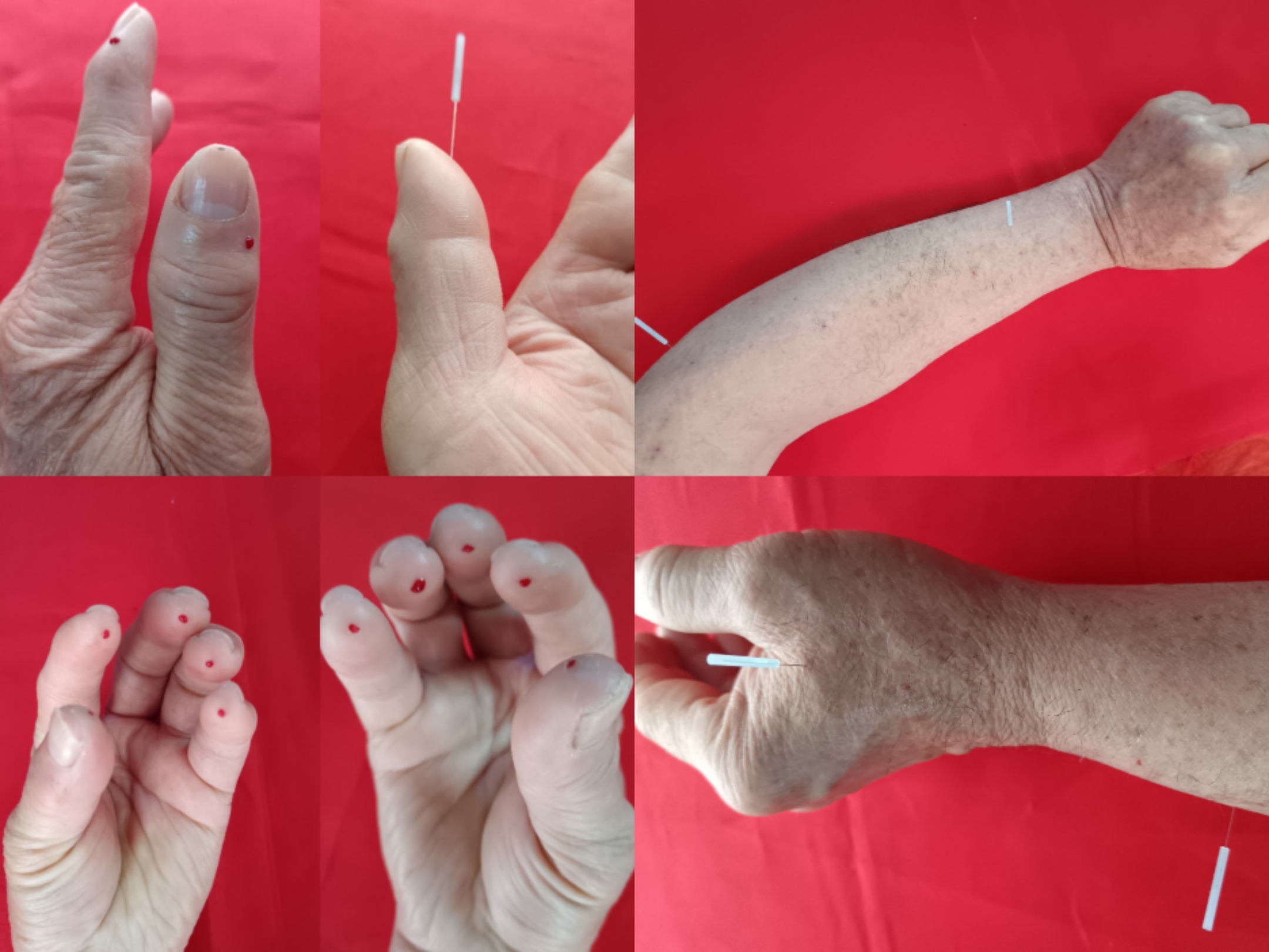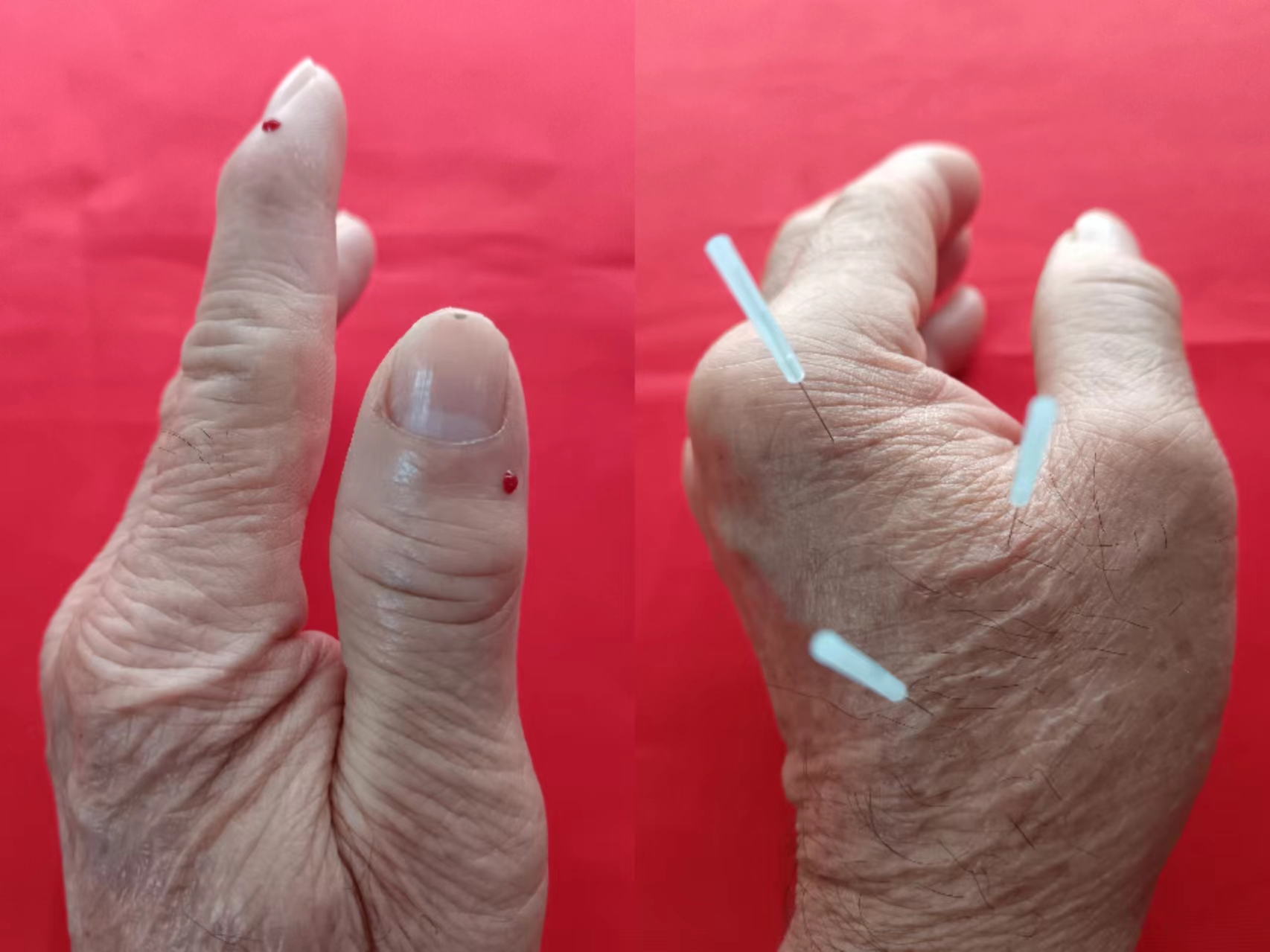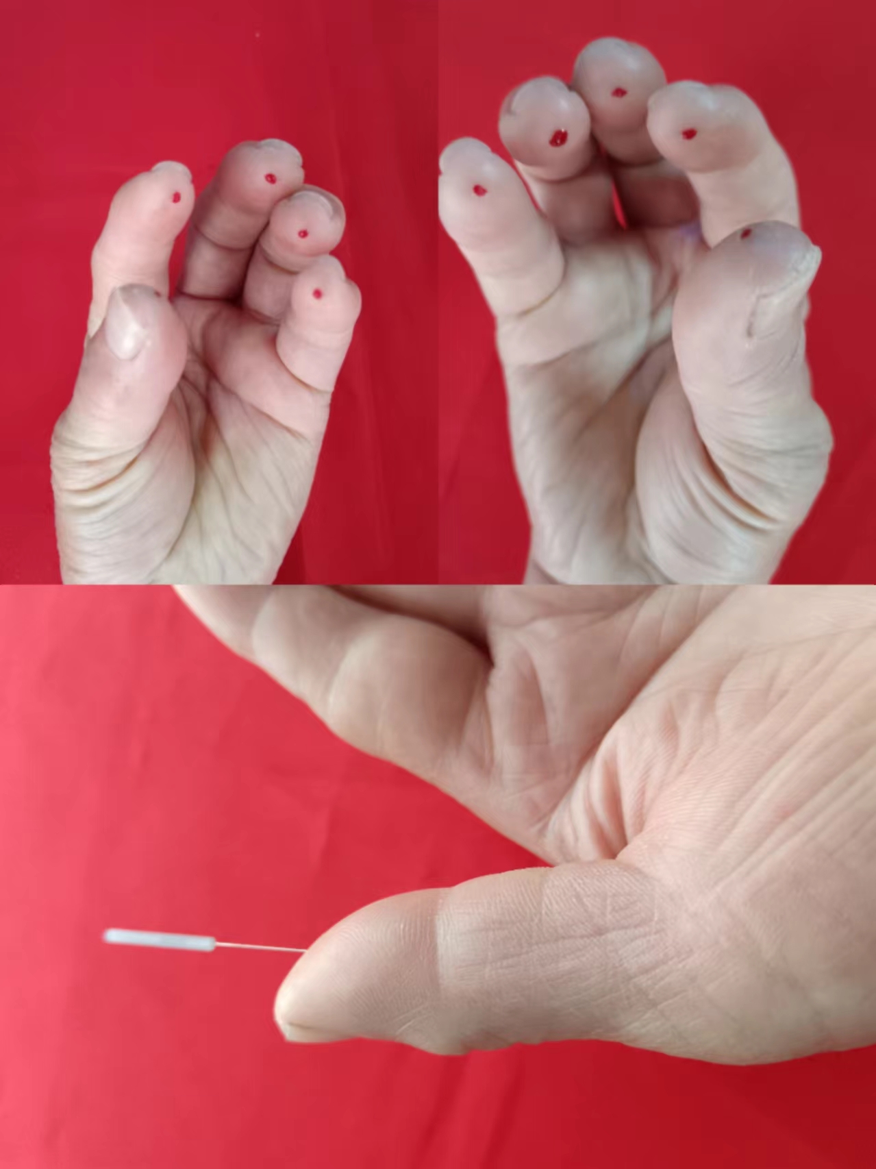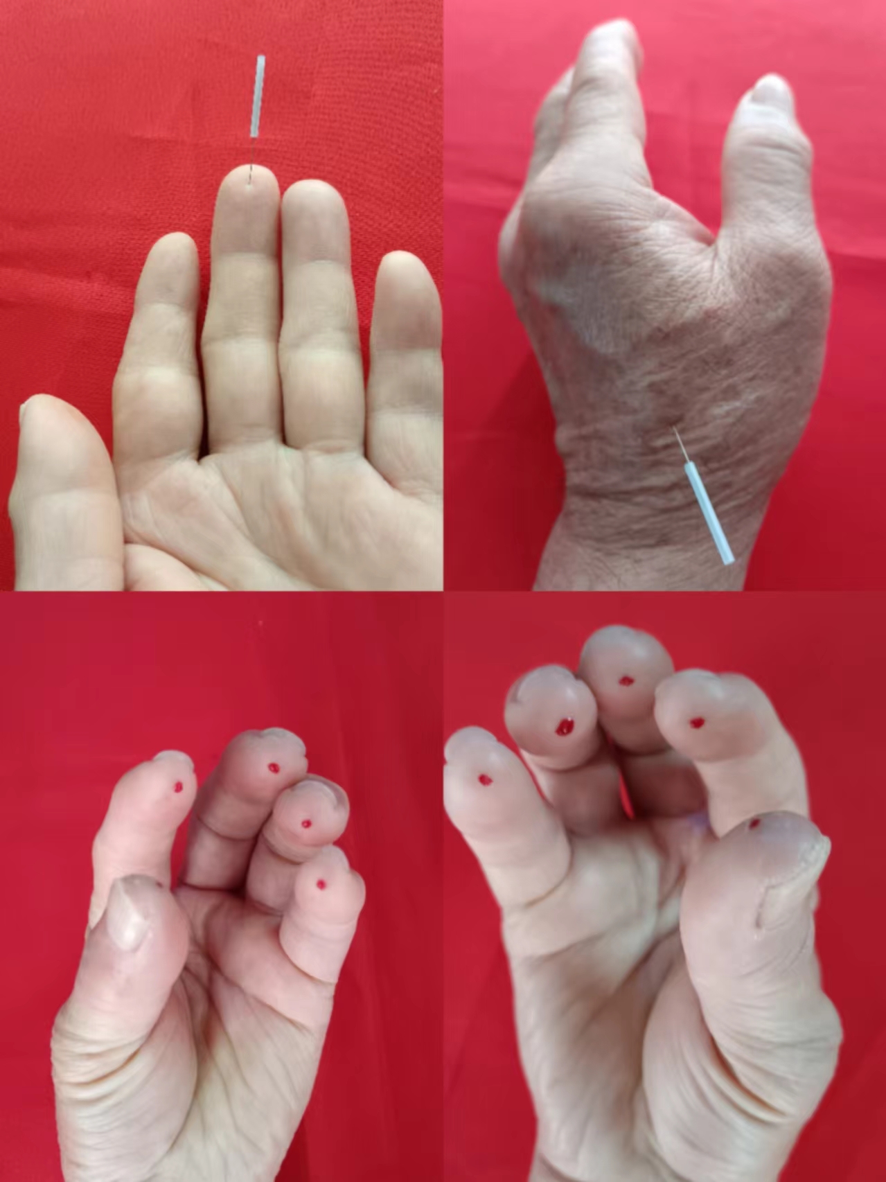 ①中指阴面末节指旋向指根方向平刺一针。