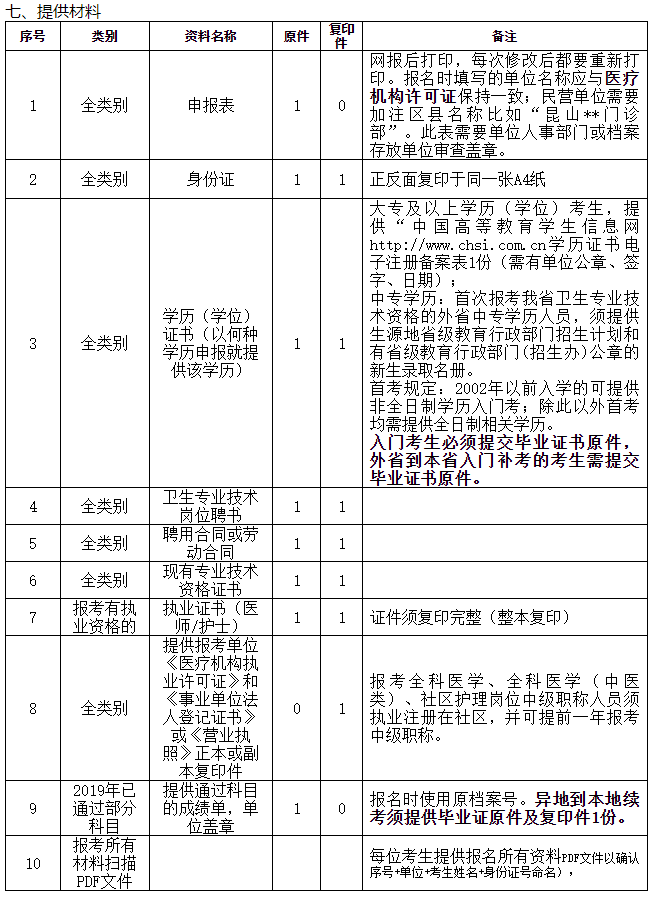 非首考考生在资格审核完成后原件当场返回,只收装订好的材料一套(不再退返);首次参加我省卫生专业技术考试的考生加收学历原件一份,提交苏州。