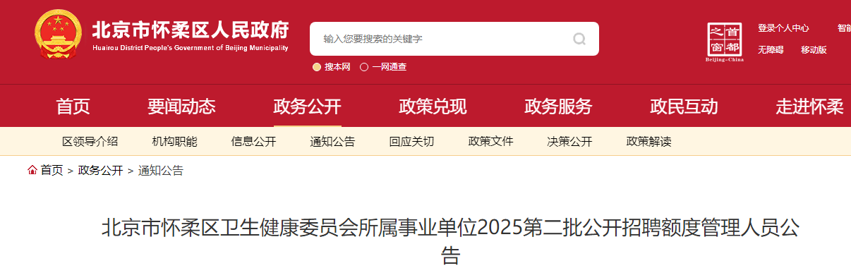 原标题:北京市怀柔区卫生健康委员会所属事业单位2025第二批公开招聘额度管理人员公告