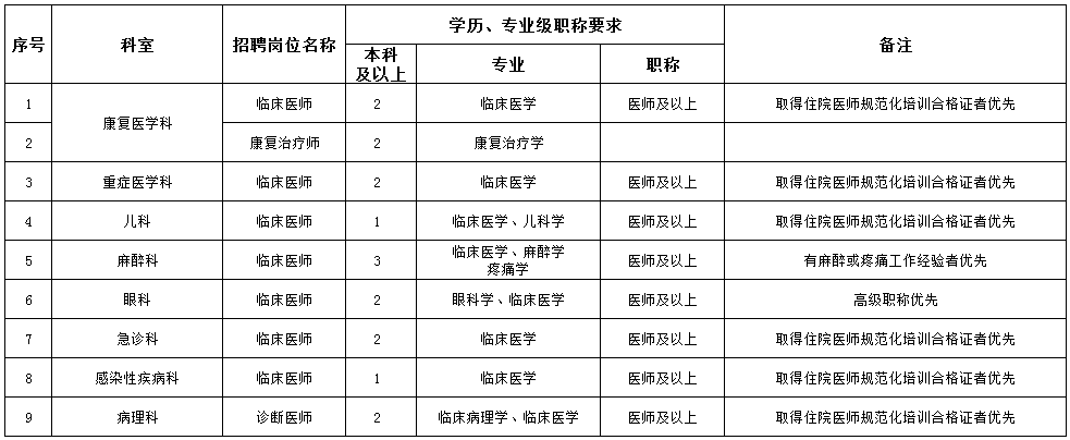 2.紧缺急需专业人才:麻醉科、儿科、重症医学科、急诊科、全科医学科、康复医学科、眼科、病理科、心脑电生理科等。