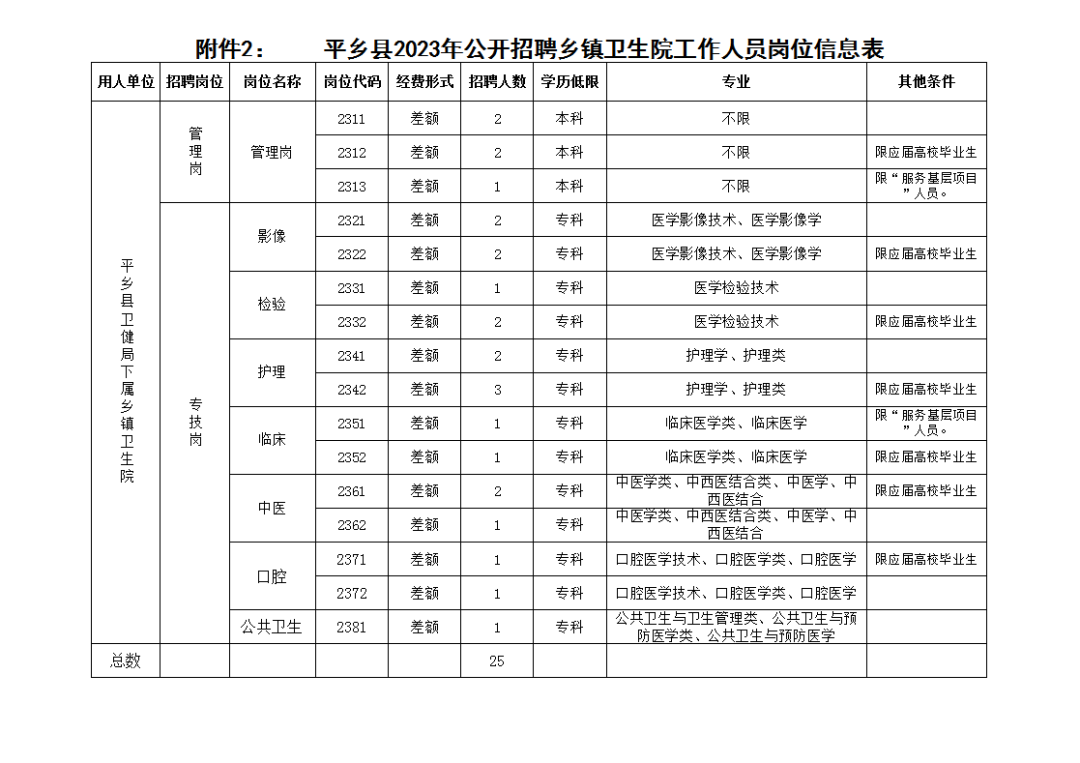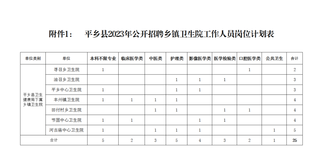 公开招聘乡镇卫生院工作人员25名。其中:管理岗5名,专技岗20名。详见《平乡县2023年公开招聘乡镇卫生院工作人员岗位计划表》(附件1),《平乡县2023年公开招聘乡镇卫生院工作人员岗位信息表》(附件2)。