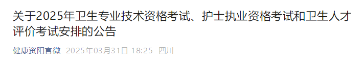 2025年卫生专业技术资格考试将于4月12、13、19、20日举行,护士执业资格考试将于4月26、27日举行,卫生人才评价考试将于4月19日举行,考试具体安排如下: