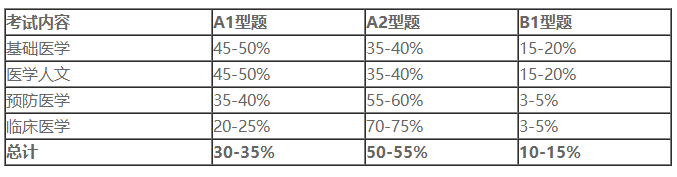 理论考试总题量为330题(其中30题用于考试研究,不计入考生水平测试总成绩)。其中,基础医学占40-45%,医学人文占5-10%,预防医学占5-10%,临床医学占40-45%。