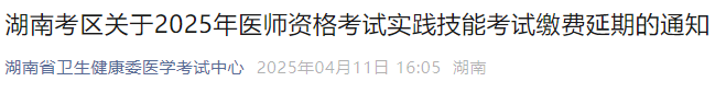 缴费延期!湖南省2025年医师资格实践技能缴费延长至4月12日!以下为考点官方发布的提醒,请相关考生按时完成缴费,否则影响报名&考试资格!