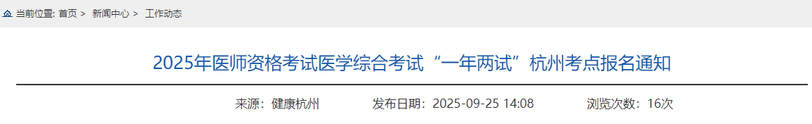 根据浙江省医师资格考试领导小组办公室《关于开展2025年医师资格考试医学综合考试“一年两试”工作的通知》的规定,杭州考点将继续参加2025年医师资格考试医学综合考试“一年两试”工作。现就有关事项通知如下: