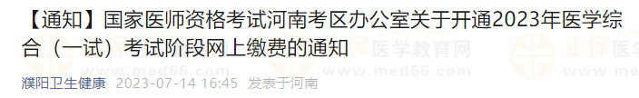 按照国家医师资格考试工作安排,经研究,河南考区定于2023年7月17日-31日开通2023年国家医师资格考试医学综合(一试)考试阶段网上缴费。逾期未缴费成功者视为放弃医学综合考试资格。