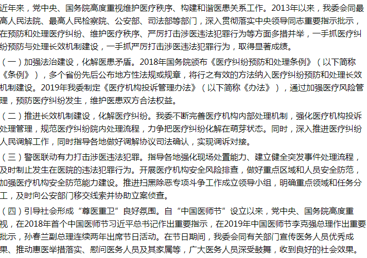 (四)加强医德医风教育,营造尊医重卫良好氛围。我委将继续加强医务人员医德医风教育,促进其规范执业,努力提高患者满意度。同时,营造主流舆论,增强群众对医务工作的理解和支持,在全社会形成尊医重卫的良好氛围。