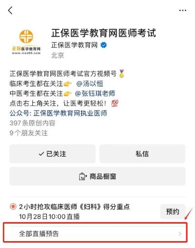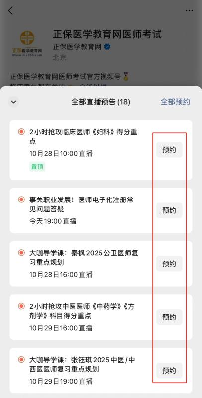 关注微信视频号"正保医学教育网医师考试",可以直接点击预约直播。直播当天会收到开播提醒。
