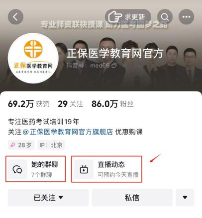 关注抖音号"正保医学教育网官方",添加关注后可以在账号主页进入粉丝群。直播当天会收到开播提醒。