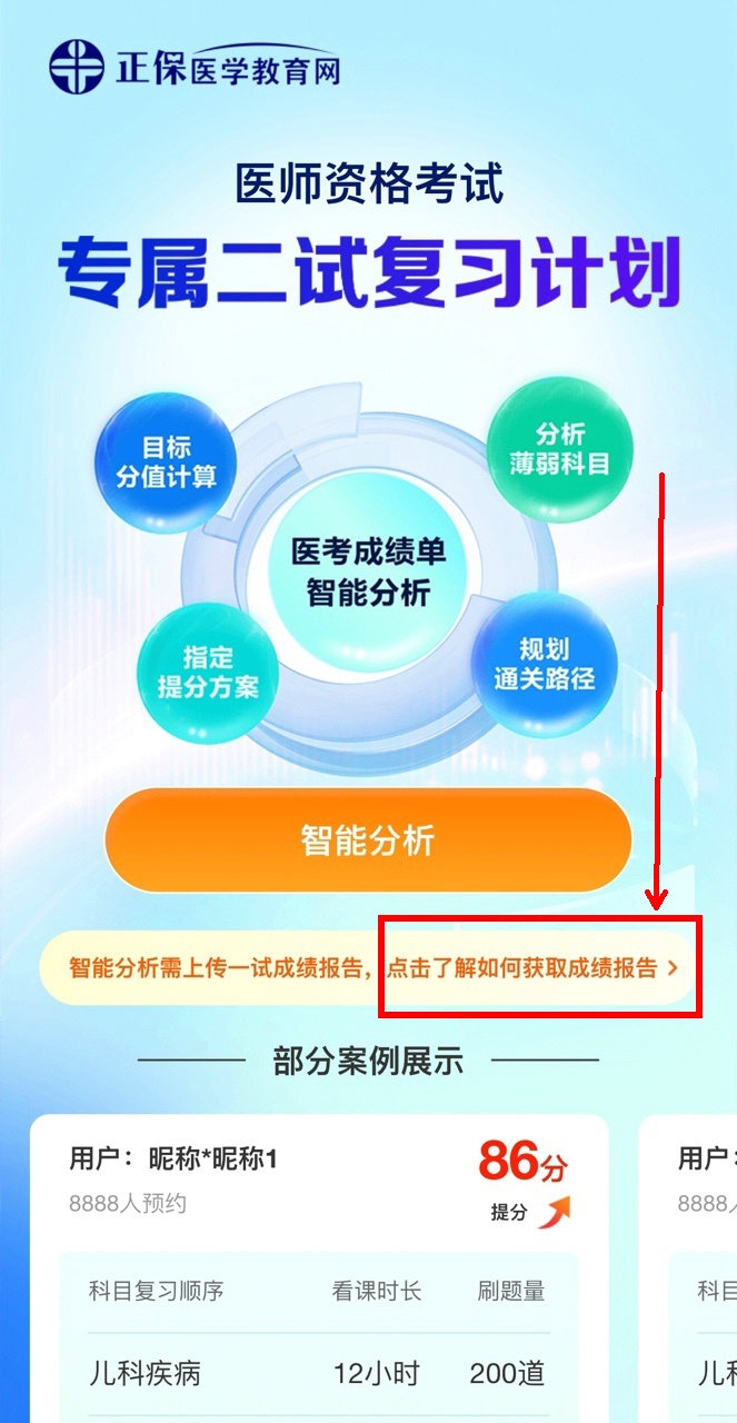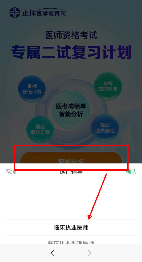 (1)点击页面“智能分析”,选择对应的考试类别入口,比如:临床执业医师;