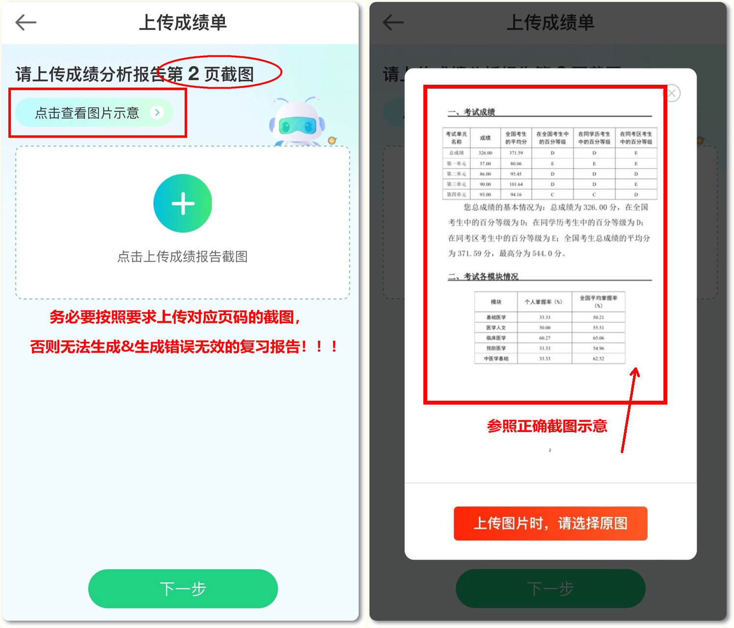 (3)按照要求上传完成绩单截图后,系统会自动识别出各科目的掌握情况,点击“下一步”即可。