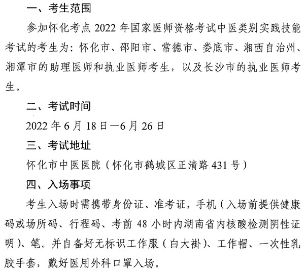 根据《2022年怀化考点国家医师资格考试(中医类别)实践技能考试考生须知》,怀化考点2022年国家医师资格考试实践技能基地考试时间/地址如下。
