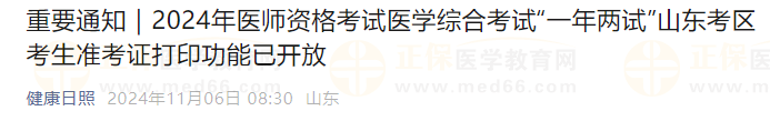 注意!山东日照考点2024年医师资格考试“一年两试”准考证打印已开始!官方通知内容包含准考证打印、考生注意事项及考点联系方式,请各位考生及时查看,做好二试应试准备!