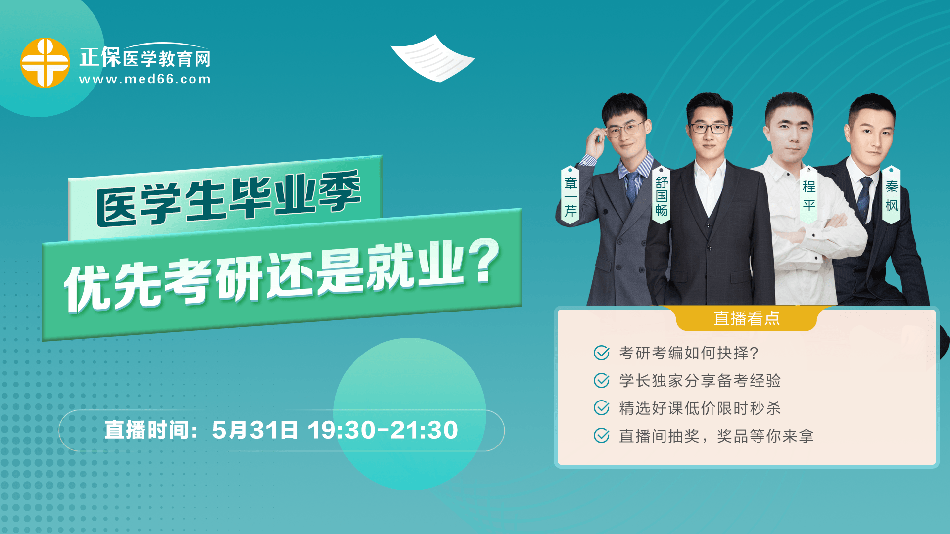 对于医学生来说,每年的毕业季,都有一个困扰大家的问题,那就是优先考研还是就业?如果你也正面临这个问题,那不妨来听听过来人的建议!今晚19:30,医学教育网直播间,舒国畅、秦枫、章一芹等网校专业老师,为你解惑!