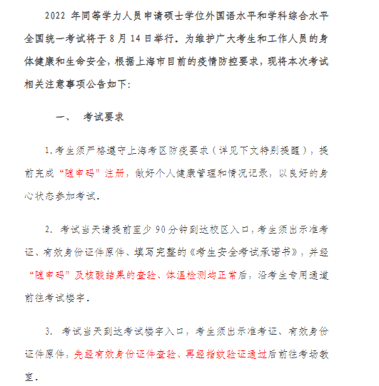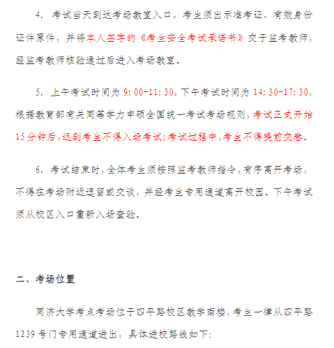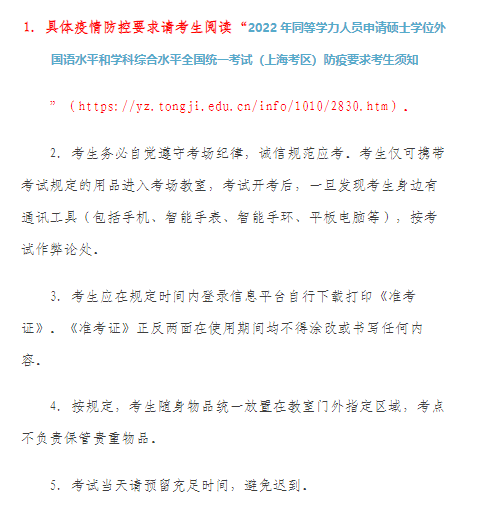 以上就是“2022年同等学力人员申请硕士学位全国统一考试同济大学考点公告”的全部内容,希望对大家有所帮助!想了解更多硕士研究生考试相关内容,请继续关注医学教育网医学考研栏目。