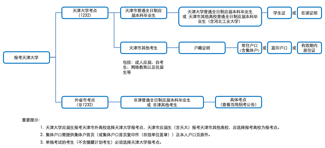 天津大学报考点只接收“全国统考”、“管理类联考”、“法硕联考”和“单独考试”四种考试方式的考生报名。