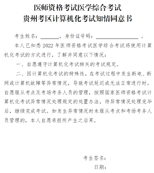 2022年贵州考区中西医执业助理医师笔试考试计算机化考试知情同意书